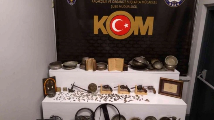 Kayseri İl Emniyet Müdürlüğü Kaçakçılık ve Organize Suçlarla Mücadele Şube Müdürlüğü ekipleri tarafından yapılan çalışmalarda, tespit edilen şüpheli bir şahsın ikametine operasyon düzenlendi. İkamette yapılan aramalarda 350 adet değişik dönemlere ait sikke, 4 adet tarihi eser niteliğinde toplu tabanca, 2 adet tarihi eser niteliğinde kitap (Kur’an-ı Kerim), 2 adet ok ucu, 1 adet kolye ucu, 13 adet değişik dönemlere yüzük, 1 adet dedektör ve 2 adet başlığı ve 1 adet başlık feneri, 3 adet tarihi eser niteliğinde kama, 1 adet yarım ay şeklinde üzerinde Arapça ibareli balta, 62 adet tarihi eser niteliğinde değişik dönemlere ait metal tabak, kase, sürahi, 1 adet çerçeve içerisinde Arapça yazılı tablo ve 1 adet üzeri işlemeli pencere görünümlü ayna bulundu.