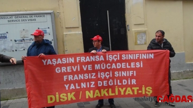 Fransa’da yeni emeklilik yasası reformu hayatı felç etmeye ve hükümeti sarsmaya devam ederken, çeşitli sendikalar da duruma tepki göstermeyi sürdürüyor. Nakliyat-İş Sendikası Genel Başkanı Ali Rıza Küçükosmanoğlu ve beraberindeki sendika üyeleri, Fransa İstanbul Başkonsolosluğu önüne gelerek, Fransa’daki emeklilik reformunu protesto amacıyla basın açıklaması düzenledi.