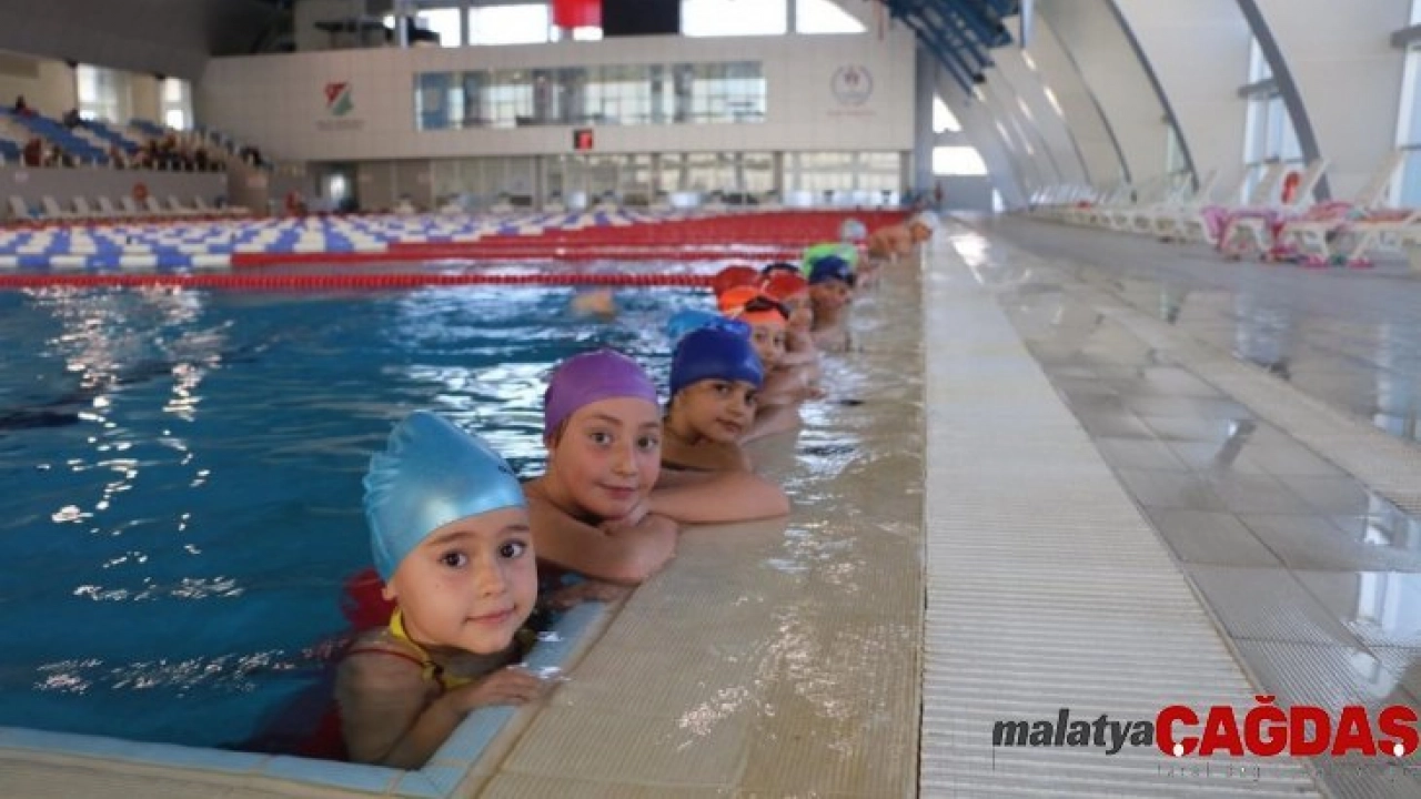 Köy okulları başta olmak üzere il genelindeki çeşitli okullardan servislerle getirilen öğrenciler, uzman antrenörler eşliğinde yüzme eğitimi alıyor.