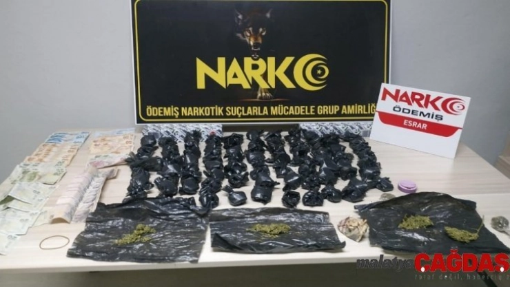 Ödemiş İlçe Emniyet Müdürlüğü Narkotik Suçlarla Mücadele Şubesi ekipleri, uyuşturucu madde ticaret yapan ve uyuşturucu madde kullanan şahıslara yönelik çalışmalarına devam ederken, B.K. isimli kişinin uyuşturucu ticareti yaptığı bilgisine ulaştı. Ekipler bunun üzerine hemen şüpheliyi yakın takibe aldı. B.K.’nın evinin önüne gelen iki araçta bulunan kişilere bazı malzemeler verdiğinin tespiti üzerine operasyonun düğmesine basıldı. Baskında B.K. ile araçlarda bulunan S.K, T.U, ve H.K. gözaltına alındı. B.K.’nin evinde de aramalar yapıldı ve 514 gram esrar ile uyuşturucu satışından elde edildiği değerlendirilen bin 540 lira ele geçirildi. Diğer şüphelilerin üst aramasında ise 13 gram esrar bulundu.