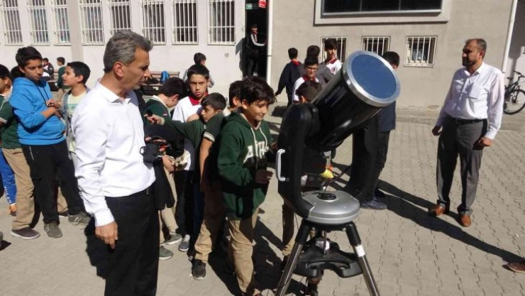 Adıyaman Anadolu İmam Hatip Fen ve Sosyal Bilimler Proje Ortaokulu bahçesinde kurulan teleskop ile öğrenciler güneş tutulmasını izledi.