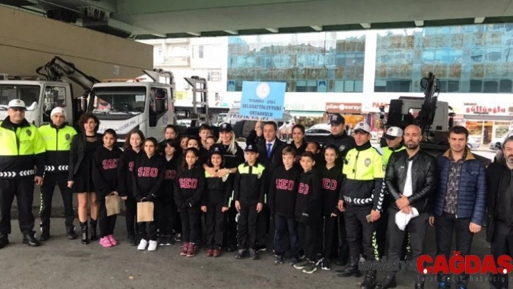 Mecidiyeköy Meydanı’nda toplanan öğrenciler temsili polis üniforması giyerek trafik kontrolü gerçekleştirdi. Kontrolde sürücülere düdük çalan çocuklar onları trafik kurallarına dikkat etmeleri konusunda uyardı. Renkli görüntülerin oluştuğu etkinlikte, öğrenciler polis memurlarıyla fotoğraf çektirdi.