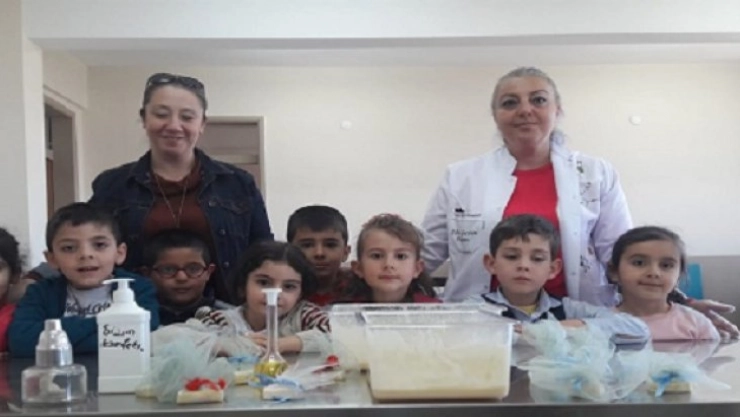 Erzurum palandöken ilçesi İbrahim Erkal İlkokulu Anasınıfı Öğrencileri Yağdan Sabun Üretti, Erzurum Yakutiye Elektrik Elektronik Teknolojisi Mesleki ve Teknik Anadolu Lise öğrencileri ve anasınıfı öğrencilerini bir araya getirerek organik atıkları kullanarak dezenfektan, esans, kolonya ve sabun yaptılar.