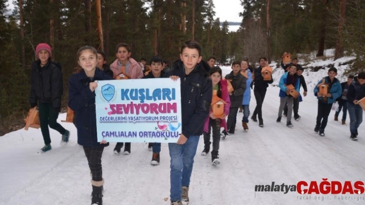 “Kuşları Seviyorum Değerlerimi Yaşatıyorum Projesi” adı altında kuş yuvaları öğretmenler ve öğrenciler tarafından kar yağışı altında ormanda ağaçlara yerleştirilerek içlerine yem konuldu.