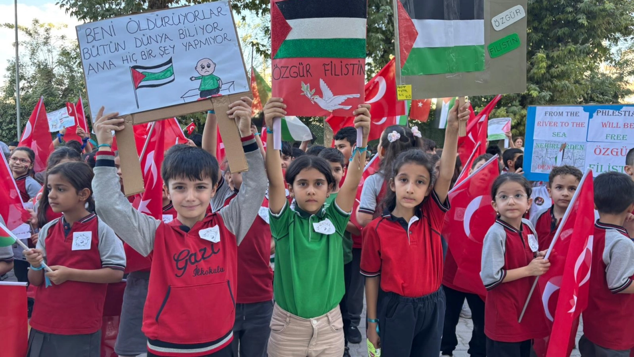 Ellerinde Türk ve Filistin bayrağı taşıyan öğrenciler, Türkçe ve İngilizce "özgür Filistin" dedi.