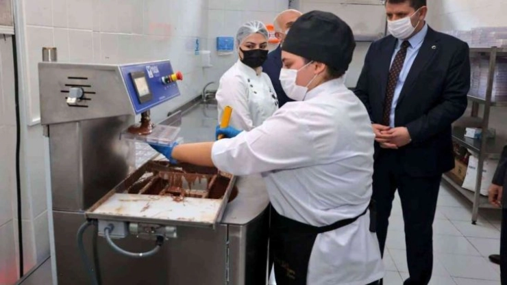 Milli Eğitim Bakanlığınca hayata geçirilen "Mesleki Eğitimde 1000 Okul" Projesi kapsamında okul bünyesinde kurulan çikolata üretim atölyesinde incelemelerde bulunan Ayhan, "Çikolis" markalı çikolataların üretim aşaması ile ilgili bilgi aldı.