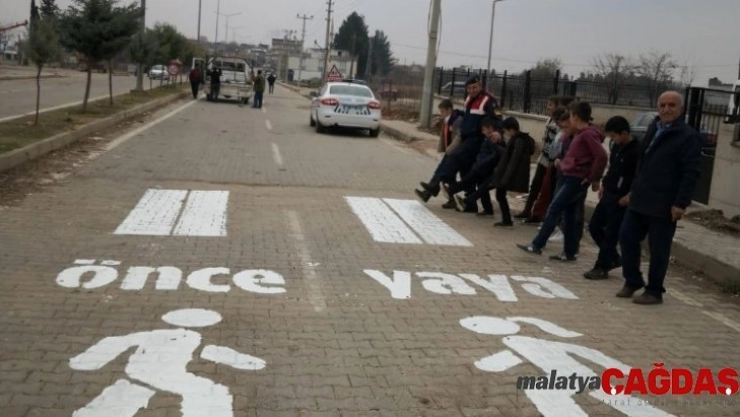 Adıyaman İl Jandarma Komutanlığına bağlı Trafik Timleri tarafından okul önlerine Önce yaya görselleri çizildi.