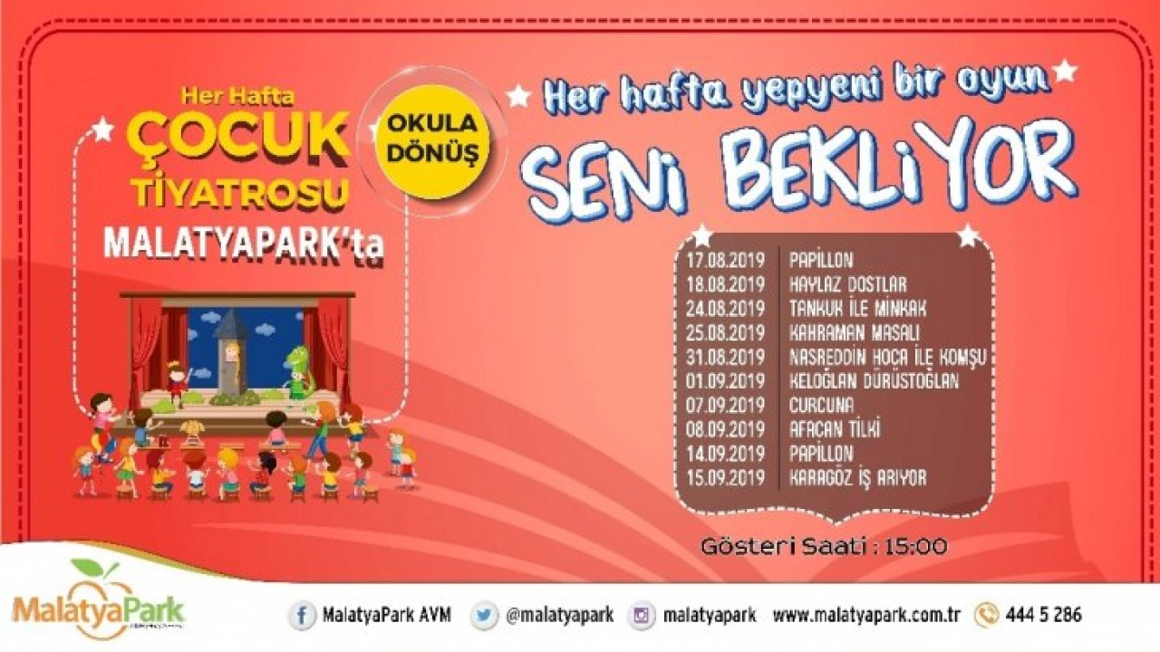 Malatyapark Alışveriş ve Yaşam Merkezi, 17 Ağustos -15 Eylül tarihleri arasında, her hafta sonu yaza veda edip okula merhaba diyen çocukları motive etmek ve yeni okul sezonuna uyumlarını sağlamak amacıyla birbirinden renkli etkinliklere ev sahipliği yapıyor. Okula dönüş döneminde her Cumartesi - Pazar günü saat 15.00’te miniklere eğlenceli anlar yaşatan tiyatro etkinliğinin son gösterisi 14-15 Eylül’de ‘Papillon ve Karagöz İş Arıyor’ ile Malatyapark’ta tüm çocuklar ve ailelerini keyifli anlar yaşamaya davet ediyor.