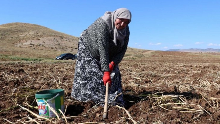 Sivas'ta onlarca vatandaş hasat edildikten sonra toprak altında kalan patatesleri tek tek elleriyle bularak topluyorlar.