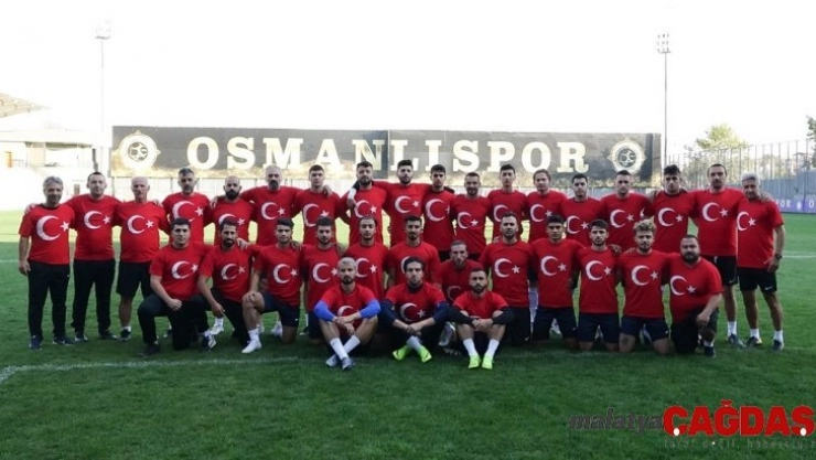 Osmanlısporlu teknik heyet, futbolcular ve personel, önceki gün başlayan 'Barış Pınarı Hareketi'nde görevli Mehmetçiğe destek amacıyla antrenmana Türk bayrağı tişörtleriyle çıktı.