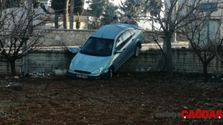 Otomobil bahçe duvarını aşıp askıda kaldı