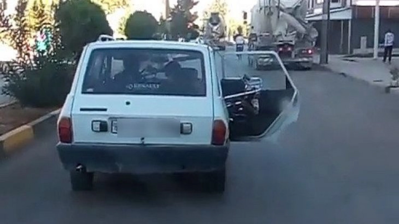 Adıyaman'da, içerisine konulan motosiklet nedeniyle kapıları kapanmayan otomobil, açık kapıyla trafikte ilerledi.
