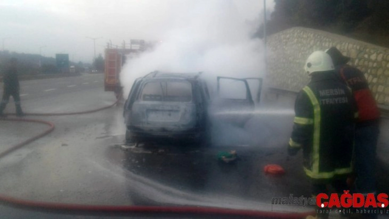 Mersin'in Tarsus ilçesi TEM otoyolunda seyir halindeki otomobilin motor kısmı bilinmeyen nedenden alev aldı. Sürücünün güvenlik şeridine çektiği aracın her tarafını saran alevler, aracı hurdaya döndürdü. Olayda şans eseri araçtaki 3 kişi yara almadan kurtuldu.