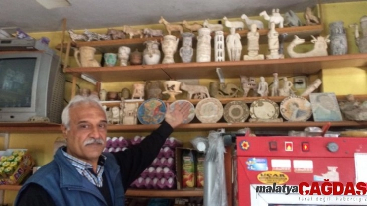 Osmaniye'nin Kadirli ilçesinde 32 yıldır mahalle bakkalı Yusuf Aslansofuoğlu, iş yerinde küçük bir tezgahta çakı ve çekiçle yaptığı yüzlerce taştan heykelciği bakkalında sergiliyor.