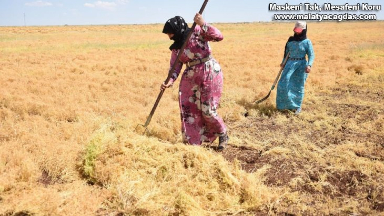 Tarlada traktör yardımıyla hasat çalışmalarına başlanılan mercimekler kadınlar tarafından tırmıklarla toplanarak hasadın ardından patoz makinasına vurularak saman ve mercimek ayrıştırılacak.
