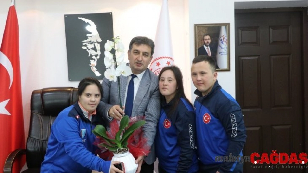 Kendilerine verdikleri desteklerden ve ilgiden dolayı aileleri ve antrenörleri ile birlikte İl Müdürü Eskici’ye teşekkür ziyaretinde bulunan Özel Sporcular Eskici’ye Çiçek hediye ettiler.