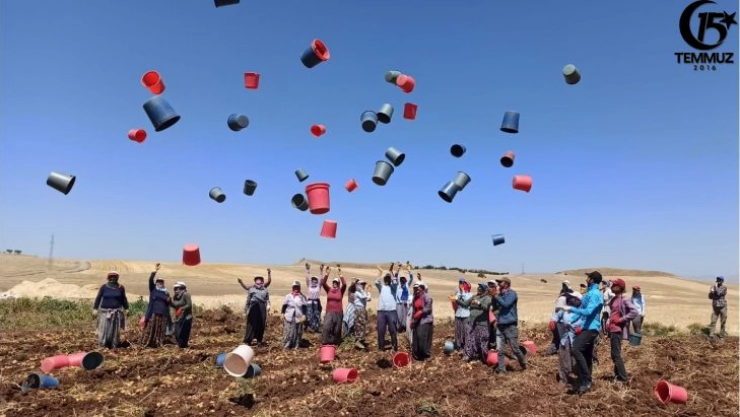 Tarım işçileri, günün sonunda patates topladıkları kovaları toplu olarak havaya fırlatarak günü bitirmenin mutluluğunu yaşadı.