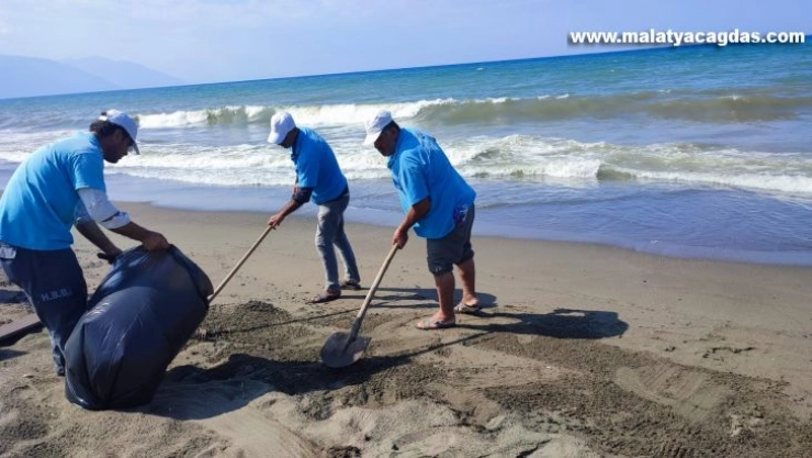 Hatay’ın Samandağ ilçesinde sahile vuran petrol atıkları, Hatay Büyükşehir Belediyesi ve Sahil Güvenlik ekipleri tarafından temizlendi.
