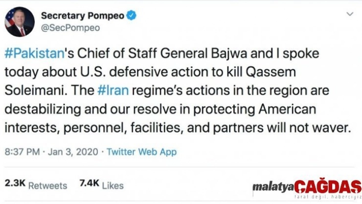 ABD Dışişleri Bakanı Mike Pompeo, İranlı General Süleymani’nin ölümüyle ilgili Pakistan Ordusu Genelkurmay Başkanı Qamar Javed Bajwa ile telefon görüşmesi gerçekleştirdi. Pompeo görüşmeye ilişkin yaptığı Twitter açıklamasında, “Pakistan Ordusu Genelkurmay Başkanı Bajwa ile ABD’nin Kasım Süleymani’yi savunma amaçlı öldürmesi üzerine konuşmak için görüşme gerçekleştirdik. İran rejimi bölgeyi istikrarsızlaşıyor. Bizim Amerika’nın çıkarlarını, personelini, tesislerini ve ortaklarını koruma kararlığımız değişmeyecek” ifadelerini kullandı.