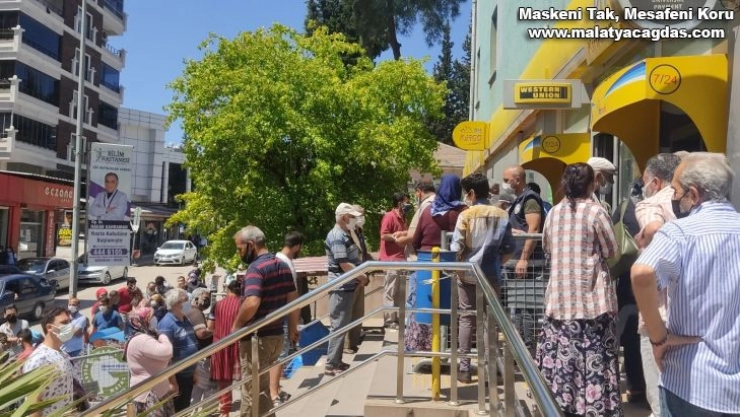 Hatay'da 65 yaş üzerindeki vatandaşlar, yaşlılık aylığı almak için PTT şubesi önünde kuyruk oluşturdu.
