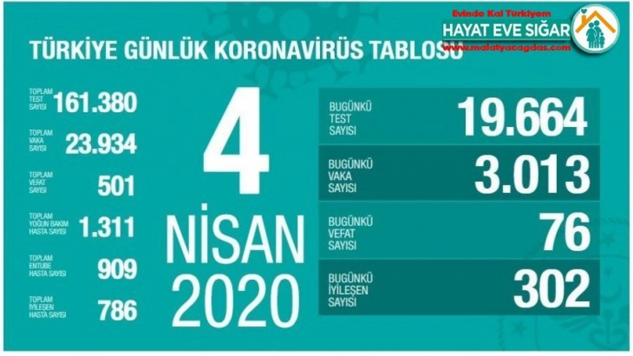 Sağlık Bakanı Fahrettin Koca, son 24 saatteki korona virüsle ilgili verileri paylaştı. Koca, son 24 saatte 3 bin 13 kişiye Kovid-19 tanısı konulduğunu, 76 kişi hayatını kaybettiğini, toplam vaka sayısının 23 bin 934’e, can kaybının ise 501’e ulaştığını açıkladı.