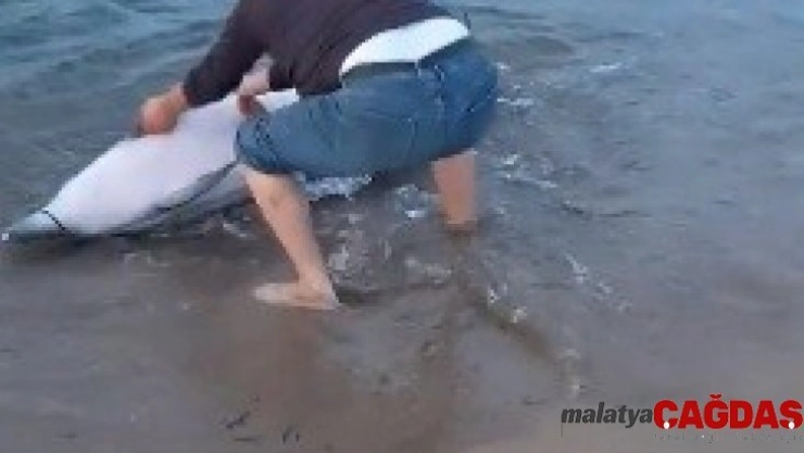 Çanakkale'nin Ezine ilçesine bağlı Geyikli beldesinde sahile vuran bir yunus balığı, Beytullah Kara'nın yoğun çabaları sonucu kurtarıldı. Paçaları sıvayıp yunus balığını kurtardığı anlar ise saniye saniye kameraya yansıdı.