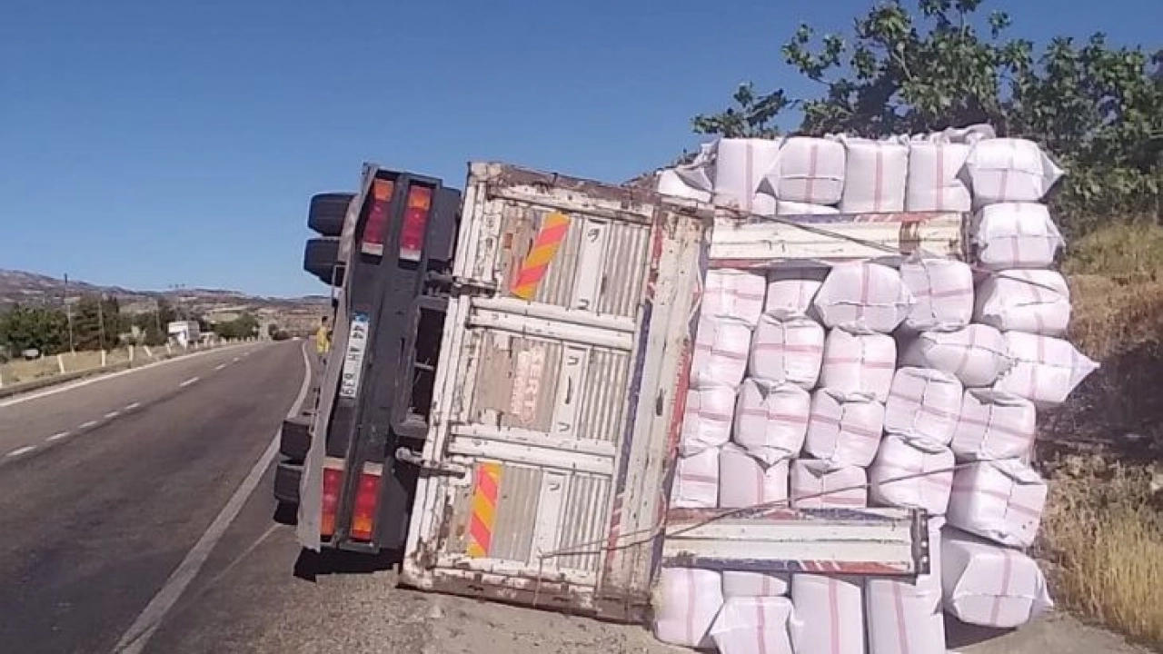 Adıyaman'da, sürücüsünün direksiyon hakimiyetini kaybettiği saman yüklü kamyon devrildi.