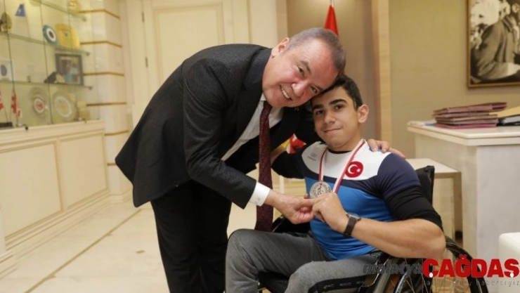 Antalya Büyükşehir Belediyesi ASAT Gençlik ve Spor Kulübü’nün Bedensel Engelli Halter Şampiyonları Serkan Çakmaz ve İsmail Korkmaz, Antrenörleri Mustafa Otum ve Ekrem Celil ile birlikte Başkan Muhittin Böcek’i ziyaret etti. 54 kiloda 2019 Türkiye Şampiyonu Serkan Çakmaz, 49 kiloda 2018 Türkiye Şampiyonu İsmail Zeki Korkmaz’ı kabul eden Başkan Böcek, engelli sporcuları başarılarından dolayı kutlayarak saat hediye etti.