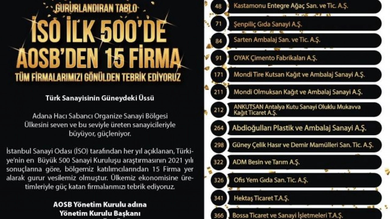 İstanbul Sanayi Odası'nın (İSO) her yıl açıkladığı Türkiye'nin 500 Büyük Sanayi Kuruluşu 2021 listesinde Adana Organize Sanayi Bölgesi'nden (AOSB) 15 firma yer aldı.
