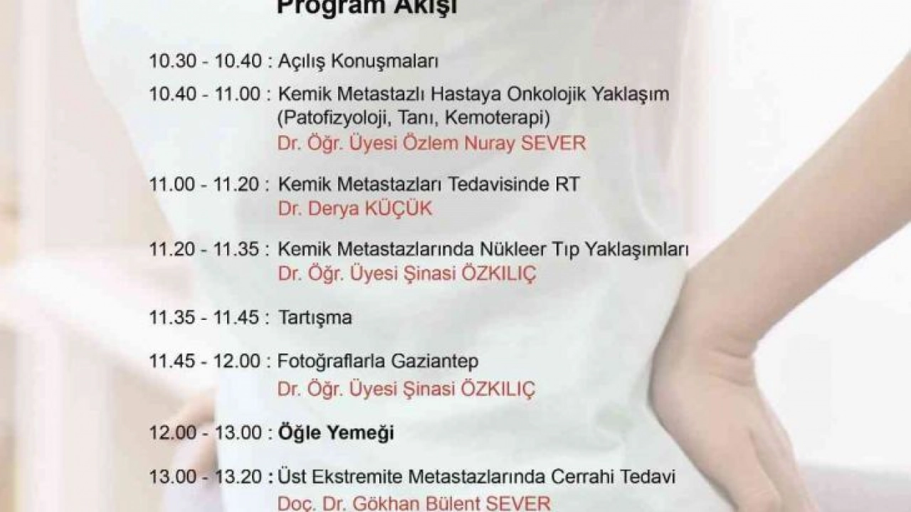 Marmara Üniversitesi Tıp Fakültesi Ortopedi ve Travmatoloji Ana Bilim Dalı’ndan Prof. Dr. Bülent Erol’un konuk konuşmacı olacağı toplantı SANKO Üniversitesi Hastanesi Anadolu Toplantı Salonu’nda saat 10.30’da başlayacak. Programda SANKO Üniversitesi Tıp Fakültesi İç Hastalıkları Tıbbi Onkoloji Uzmanı Dr. Öğr. Üyesi Özlem Nuray Sever “Kemik Metastazlı Hastaya Onkolojik Yaklaşım (Patofizyoloji, Tanı, Kemoterapi)”, SANKO Üniversitesi Tıp Fakültesi Nükleer Tıp Ana Bilim Dalı Başkanı Dr. Öğr. Üyesi Şinasi Özkılıç “Kemik Metastazlarında Nükleer Tıp Yaklaşımları”, SANKO Üniversitesi Hastanesi Ortopedi ve Travmatoloji Bölümü’nden Doç. Dr. Gökhan Bülent Sever “Üst Ekstremite Metastazlarında Cerrahi Tedavi”, Dr. Ersin Arslan Eğitim ve Araştırma Hastanesi Radyasyon Onkolojisi Uzmanı Dr. Derya Küçük, “Kemik Metastazları Tedavisinde RT”, Marmara Üniversitesi Tıp Fakültesi Ortopedi ve Travmatoloji Ana Bilim Dalı’ndan Prof. Dr. Bülent Erol, “Alt Ekstremite Metastazlarında Cerrahi Tedavi” ve “Pelvik Metastazlarda Cerrahi Tedavi” ile Tıp Fakültesi Beyin ve Sinir Cerrahisi Ana Bilim Dalı Başkanı Dr. Öğr. Üyesi Kadir Çınar, “Omurga Metastazlarında Cerrahi Tedavi” konularında bilgiler paylaşacak.