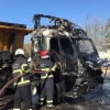 Şanlıurfa’da seyir halindeki kum yüklü tır, alev alev yandı. Alevlere teslim olan tır kullanılamaz hale geldi.