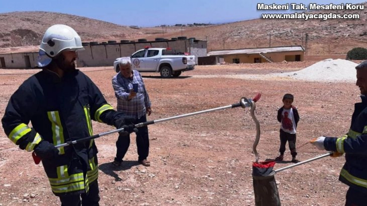 Şanlıurfa'nın Akçakale ilçesinde bir evin bahçesinde görülen yılan itfaiye ekiplerince yakalanarak doğal alana bırakıldı.