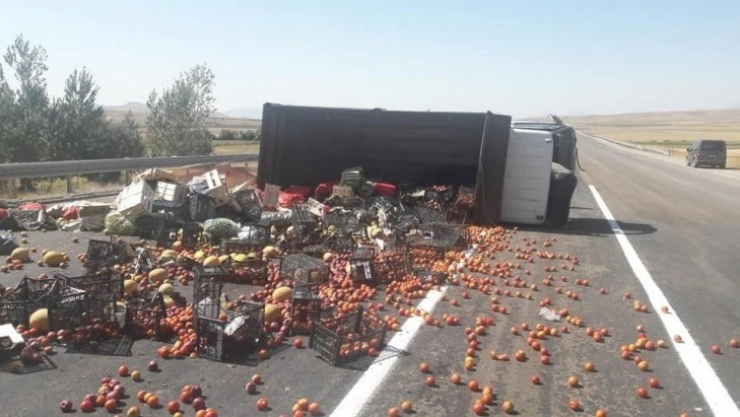 Van’ın İpekyolu ilçesinde sebze meyve yüklü kamyon devrildi.