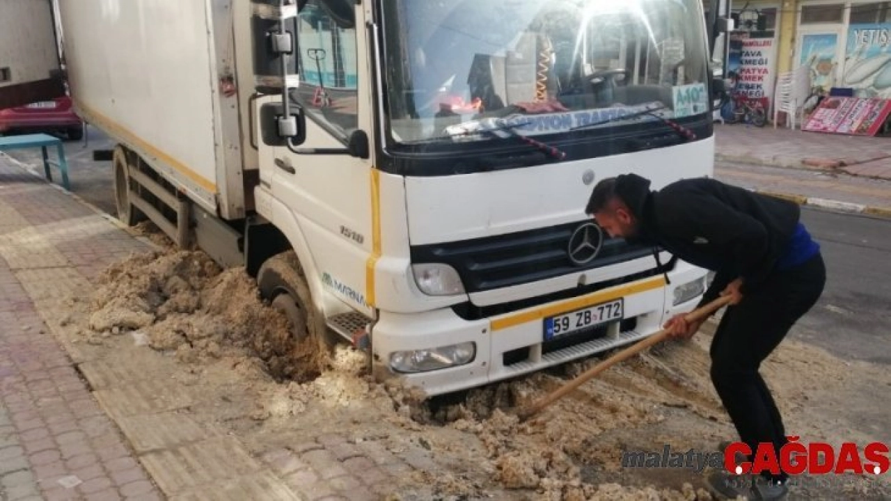 Bahçelievler Mahallesi’nde meydana gelen olayda 59 ZB 772 plakalı kamyon sürücüsü Fatih Baycan, mal yüklemek üzere bir market önüne park etti. Asfalt yolda ürünlerini boşaltan Baycan, bir anda yolun çökmesi sonucu kamyonun mahsur kaldığını belirtti. Mahsur kalan araç kamyon şoförü ve çevredekilerin yardımı ile bulunduğu noktadan kurtarıldı.