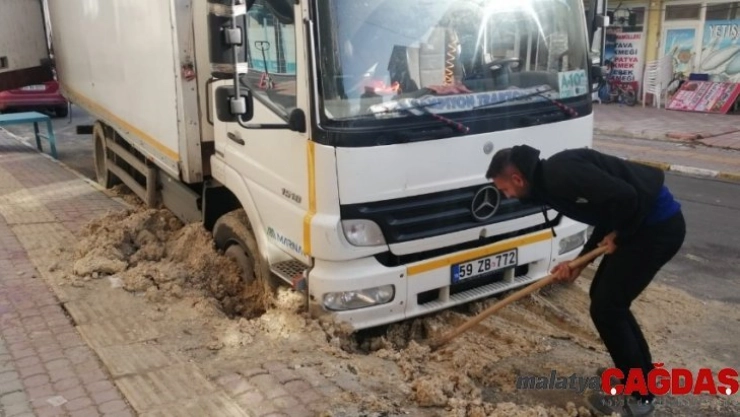 Tekirdağ'ın Kapaklı ilçesinde bir markete ürün getiren sevkiyat kamyonu, yolun çökmesi sonucu mahsur kaldı.