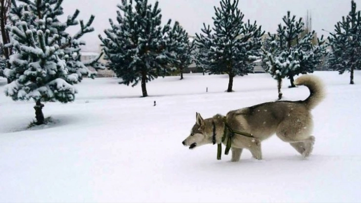 Atatürk Üniversitesi Spor Kulübü Sorumlusu Yunus Emre Karaca'nın 2 aylıkken hediye alarak bakımını üstlendiği Rosha, 5 aydır bulunduğu Erzurum'da mevsimin ilk karının yağmasıyla, beyaz örtüyle tanıştı.