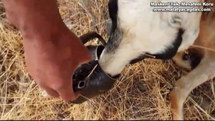 Malatya'nın Doğanşehir ilçesinde su içmek istediği kuyuya düşen koyunu, çoban Mustafa Karakaş'ın kurtardığı ve sıcak havanın etkisiyle baygınlık geçiren bir koyuna demlikle su içirdiği anlar cep telefonu kamerasıyla görüntülendi.