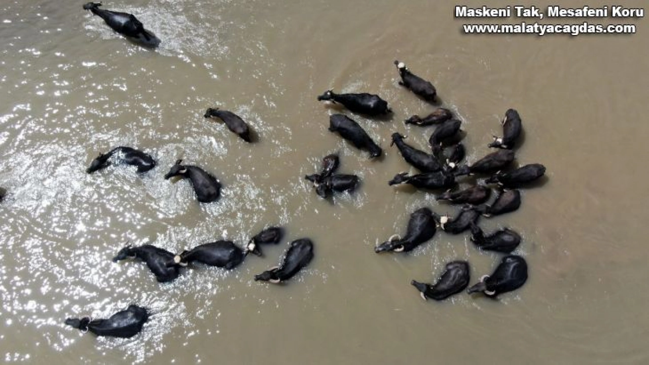 Sivas’ta sıcak havadan bunalan mandalar. Türkiye’nin en uzun nehri Kızılırmak’ta serinliyor.