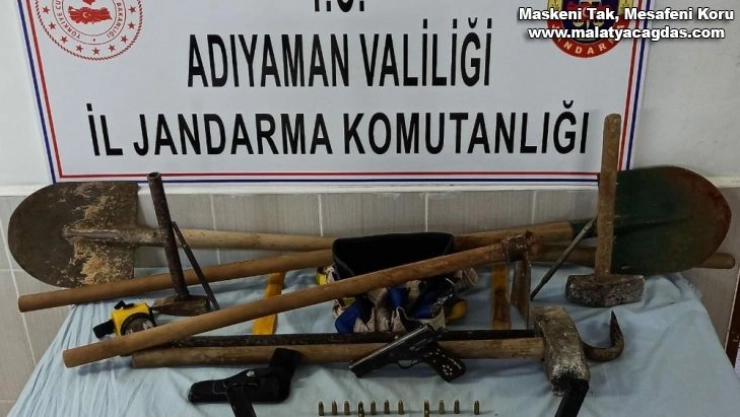 Adıyaman İl Jandarma Komutanlığı ekipleri aldıkları bir ihbarı değerlendirerek, titiz çalışma yürüttü. Adıyaman’ın Besni Dikilitaş köyünde birinci derece SİT alanında izinsiz kazı yapan H.A., E.Ö, H.S, S.K., A. K, A.Ö. ve A.A., isimli şahıslar kazı yaptıkları alanda suç üstü yakalandı.