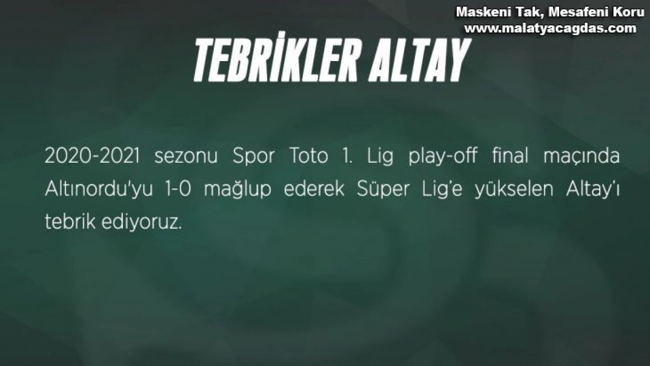 “Tebrikler Altay” başlığıyla yayımlanan mesajda, “2020-2021 sezonu Spor Toto 1. Lig play-off final maçında Altınordu’yu 1-0 mağlup ederek Süper Lig’e yükselen Altay’ı tebrik ediyoruz. Süper Lig’e hoş geldin Altay Spor Kulübü” ifadelerine yer verildi.