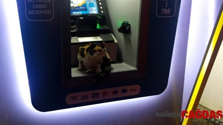 - Sokak kedisi fırtınadan ATM'ye sığındı