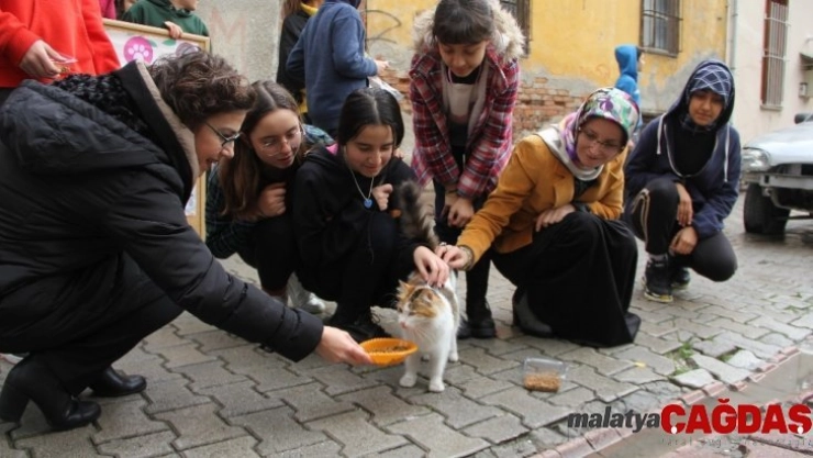 "İnsanca Pek İnsanca" başlıklı eTwinning projesi kapsamında öğrenciler kediler için sokak sokak mama dağıttı.