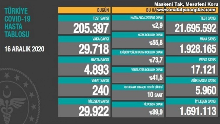 Sağlık Bakanlığının Covid-19 bilgilendirme sayfasında Türkiye’nin güncel korona virüs tablosu kamuoyuyla paylaşıldı. Tabloya göre son 24 saatte 240 kişi korona virüsten hayatını kaybetti, toplam can kaybı 17 bin 121’e yükseldi. Toplamda 21 milyon 695 bin 592 test yapıldı. Bugün yapılan 205 bin 397 testten, 29 bin 718 yeni vaka sayısı, 4 bin 893 kişinin de hastaneye yatan vaka olduğu belirtildi. Toplam vaka sayısının 1 milyon 928 bin 165 olduğu, bugün iyileşen 29 bin 922 kişiyle birlikte toplam iyileşen hasta sayısının 1 milyon 691 bin 113’de yükseldiği, toplam hastalarda zatürre oranının yüzde 2,9, ağır hasta sayısının ise 5 bin 960 olduğu açıklandı.