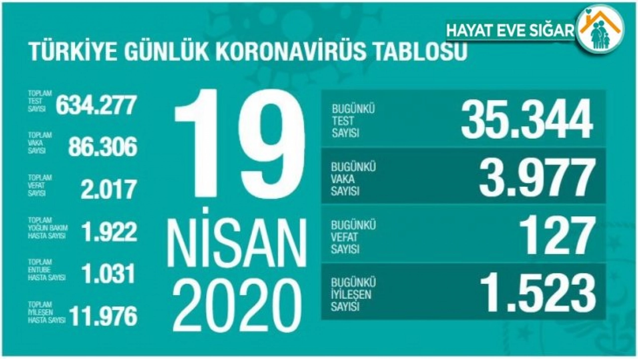 Sağlık Bakanlığı, Türkiye genelinde son 24 saatte gelişen korona virüs (Covid-19) tablosunu açıkladı. Sağlık Bakanlığının verilerine göre, son 24 saatte 35 bin 344 test yapılırken, 3 bin 977 yeni vaka tespit edildi. Ayrıca, korona virüs dolayısıyla son 24 saatte 127 kişi hayatını kaybederken, bin 523 kişi iyileşti. Bu sayılarla beraber, Türkiye genelinde yapılan toplam test sayısı 634 bin 277’ye, toplam vaka sayısı 86 bin 306’ya, toplam vefat sayısı 2 bin 17’ye, toplam yoğun bakım hasta sayısı bin 922’ye, toplam entübe hasta sayısı bin 31’e ve toplam iyileşen hasta sayısı 11 bin 976’ya yükseldi.