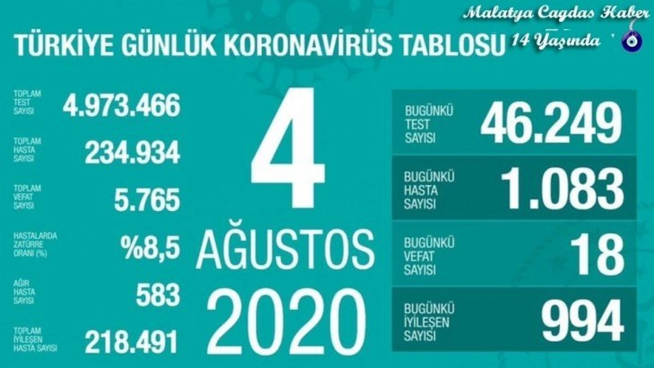 Sağlık Bakanlığından yapılan açıklamaya göre, son 24 saatte 18 kişi korona virüsten hayatını kaybetti, toplam can kaybı ise 5 bin 765’e yükseldi. Bugün toplam 46 bin 249 test yapılırken, bin 83 yeni vaka tanısı konuldu. Toplam vaka sayısı 234 bin 934 oldu. Bugün 994 kişiyle birlikte toplam iyileşen hasta sayısı da 218 bin 491’e yükseldi. Toplam hastalarda zatüre oranı yüzde 8,5, toplam ağır hasta sayısının ise 583 olduğu açıklandı.