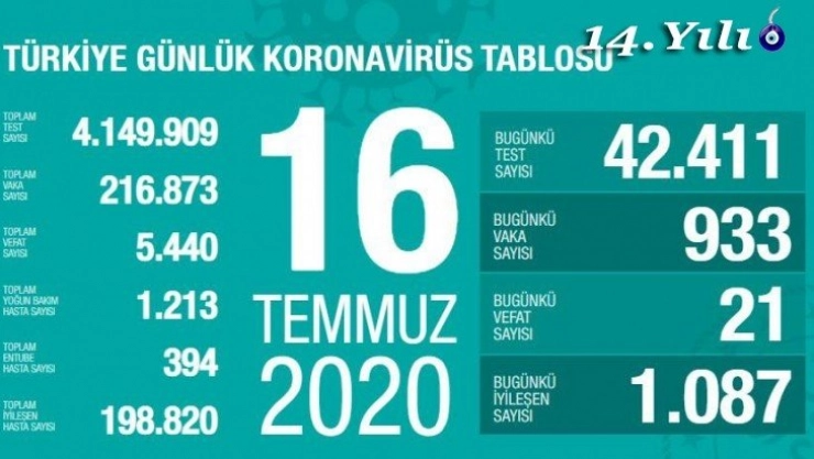 Sağlık Bakanlığından yapılan açıklamaya göre, son 24 saatte 21 kişi korona virüsten hayatını kaybetti, toplam can kaybı ise 5 bin 440’e yükseldi. Bugün toplam 42 bin 411 test yapılırken, 933 yeni vaka tanısı konuldu, toplam vaka sayısı ise 216 bin 873 oldu. Bugün bin 87 kişiyle birlikte toplam iyileşen hasta sayısı da 198 bin 820’e yükseldi. Toplam entübe hasta sayısının 394, toplam yoğun bakım hasta sayısının ise bin 213 olduğu açıklandı.