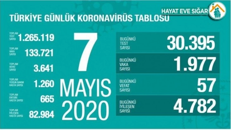 Sağlık Bakanlığından yapılan açıklamaya göre, son 24 saatte 57 kişi korona virüsten hayatını kaybetti, toplam can kaybı ise 3 bin 641 oldu. Bugün toplam 30 bin 395 test yapılırken, 1 bin 977 yeni vaka tanısı konuldu, toplam vaka sayısı ise 133 bin 721 oldu. Bugünkü 4 bin 782 kişiyle ile birlikte toplam iyileşen sayısı da 82 bin 984’e yükseldi. Toplam entübe hasta sayısının 665, toplam yoğun bakım hasta sayısının ise bin 260 olduğu açıklandı.