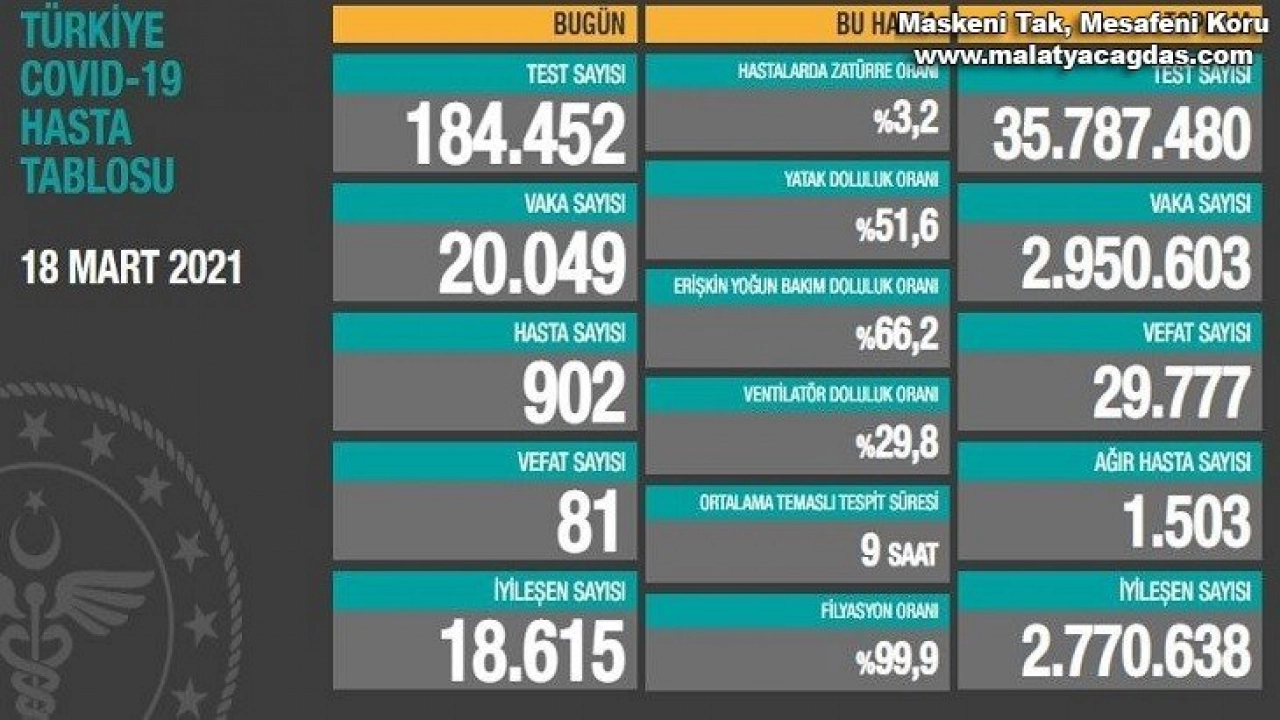 Sağlık Bakanlığının Covid-19 bilgilendirme sayfasında Türkiye’nin güncel korona virüs tablosu kamuoyuyla paylaşıldı. Tabloya göre son 24 saatte 81 kişi korona virüsten hayatını kaybetti, toplam can kaybı 29 bin 777’e yükseldi. Toplamda 35 milyon 787 bin 480 test yapıldı. Bugün yapılan 184 bin 452 testten, 20 bin 49 yeni vaka sayısı, 902 de yeni hasta sayısı olduğu belirtildi. Toplam vaka sayısının 2 milyon 950 bin 603 olduğu, bugün iyileşen 18 bin 615 kişiyle birlikte toplam iyileşen hasta sayısının 2 milyon 770 bin 638’a yükseldiği, toplam hastalarda zatürre oranının yüzde 3,2, ağır hasta sayısının ise bin 503 olduğu açıklandı.
