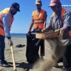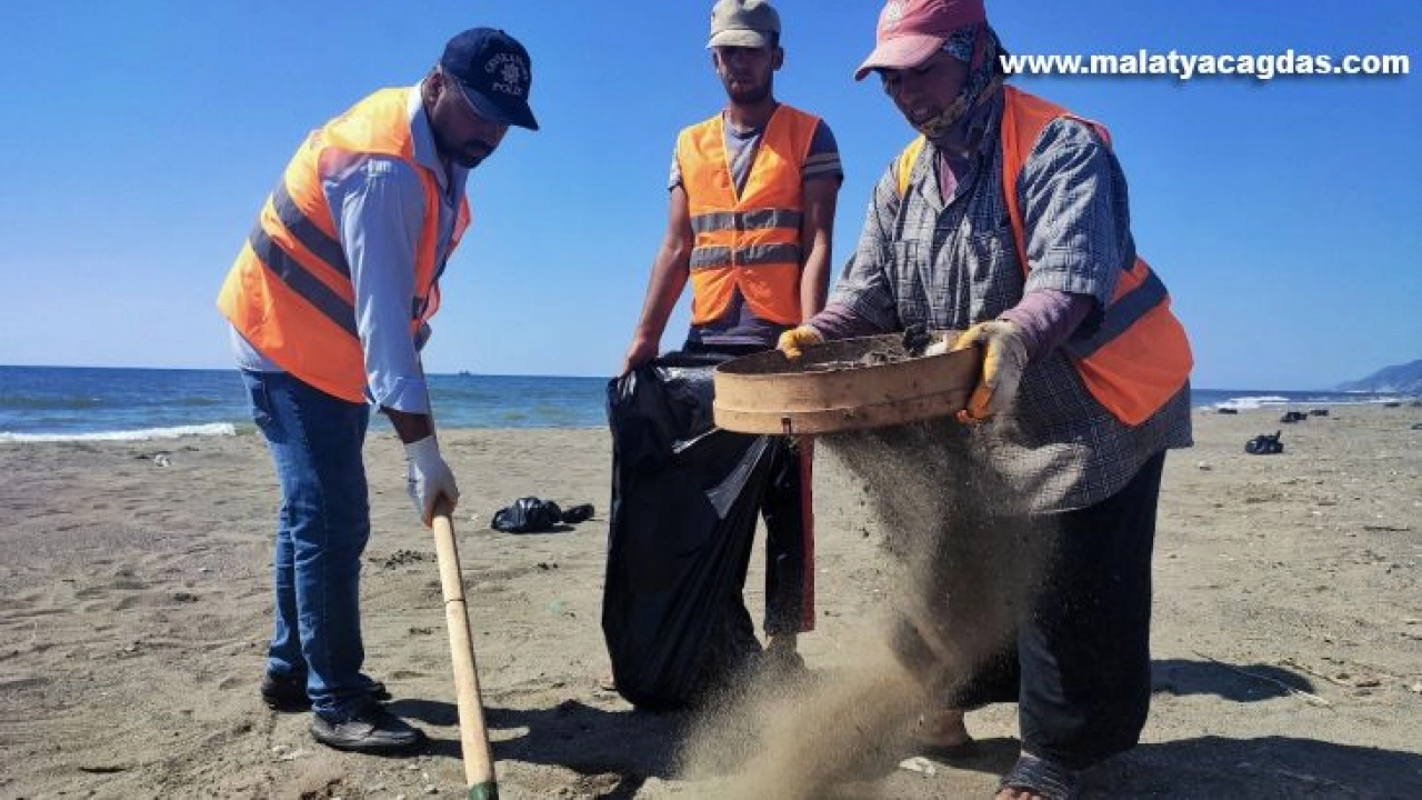 Çevre ve Şehircilik İl Müdürlüğü ekipleri, 2 Eylül’de başlayan temizlik çalışmalarını sürdürüyor. Ekipler, tırpan ve kürek kullanarak kumsaldan topladıkları atıkların kumlarını eleyip çuvallara dolduruyor.