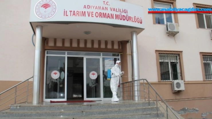 Adıyaman’da kamu kurum ve kuruluşlar korona virüsüne karşı temizlik yapıyor. Temizlik işlemlerinin yanı sıra virüsün bulaşmaması için dezenfeksiyon işlemi yapılıyor. Adıyaman Tarım ve Orman Müdürlüğü ekipleri binasında özel maskeli ekip bina girişinden tüm odalar ve koridorlar dezenfektan ile ilaçlandı.